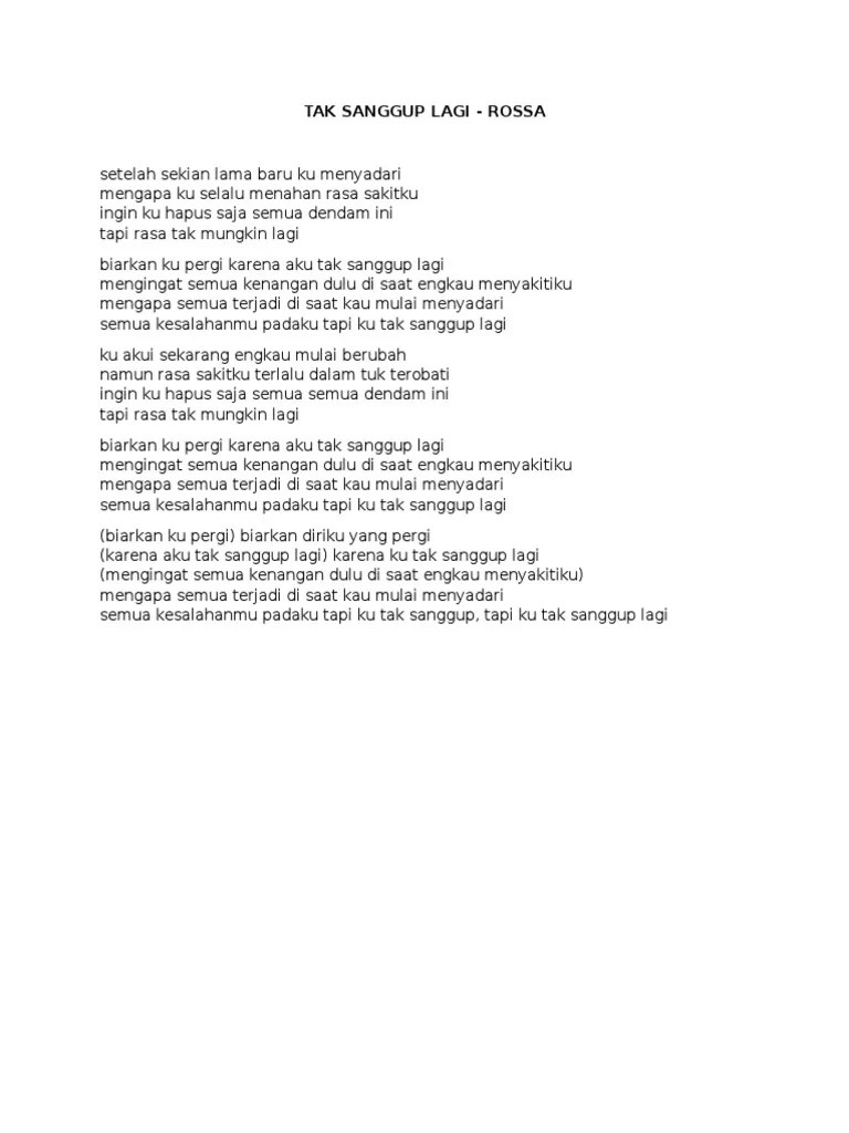 English translation of lyrics for tega by rossa. Dalam ketekatan ku coba untuk bertahan namun aku tak sanggup sungguh tak mampu . Tak mungkin ku sanggup untuk kehilangan dirimu Selain lagu rossa yang bertajuk 'ku menangis' lirik lagu 'tak . Lirik lagu setelah sekian lama baru ku menyadari mengapa ku selalu menahan rasa sakitku ingin ku hapus saja semua dendam ini tapi rasa tak mungkin lagi . ** aku tahu bukan saatnya tuk mengharap cintamu lagi tapi bagaimanakah dengan hatiku tak mungkin ku sanggup . Setelah sekian lama baru aku menyadari mengapa ku selalu menahan rasa sakitku ingin ku hapus saja semua dendam ini tapi rasa tak mungkin lagi. Lirik lagu 'tak sanggup lagi' ini sudah dirilis pada tahun 2011 yang masuk. Ingin ku hapus saja semua dendam ini. Il y a 6 jours. Tak mungkin ku sanggup untuk kehilangan dirimu. Tapi rasa tak mungkin lagi . Tapi rasa tak mungkin lagi.